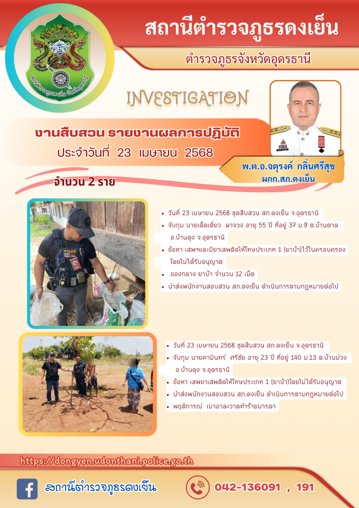การปฏิบัติงานสืบสวน วันที่ 23 เมษายน 2568 23 เมษายน 2568 โดย admin / การปฏิบัติงานสืบสวนเดือนเมษายน 2568
